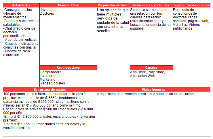 | Mercado | La competencia la mayoría de veces no hace no lazo con el usuario , nosotros nos centramos en conseguir la confianza del cliente, con usuarios que van desde menores de edad hasta adultos mayores. Se busca un gran aporte de promoción de la aplicación por medio de los doctores y redes sociales. |